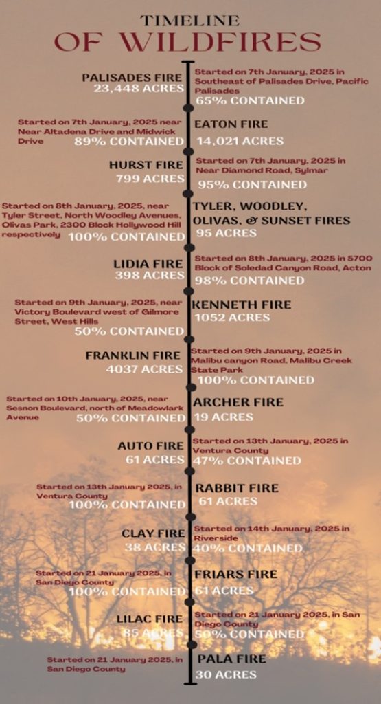 Los Angeles has been fighting a series of catastrophic wildfires that have swept through the region since January 7, 2025. These fires are fuelled by ferocious Santa Ana winds reaching 80-100 mph speed and deepened by prolonged drought conditions. Multiple fires began erupting across Southern California on January 7, 2025, leaving Los Angeles in a devastating situation and prompting mass evacuations. Palisades Fire and Eaton Fire, followed by the Hust Fire, were the initial fires that broke out and left a trail of destruction, claiming lives, displacing thousands, and destroying or damaging numerous structures.