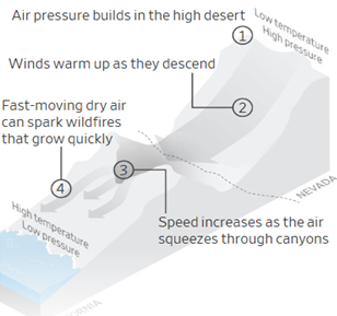 Another key reason for intensifying these fires is the warming atmosphere, which evaporates and absorbs more water with every degree of warming. This depletes moisture from the soil and plants, increases flammability, and contributes to prolonged and severe fire seasons. The Santa Ana winds further exacerbated the situation in Southern California. These strong, dry winds blow in from the deserts of the Great Basin (near Nevada), quickly drying out vegetation and fanning the flames of existing fires, enabling them to spread rapidly.