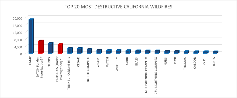 - The Camp Fire of November 2018 tops the list of California’s Top 20 most destructive wildfires.