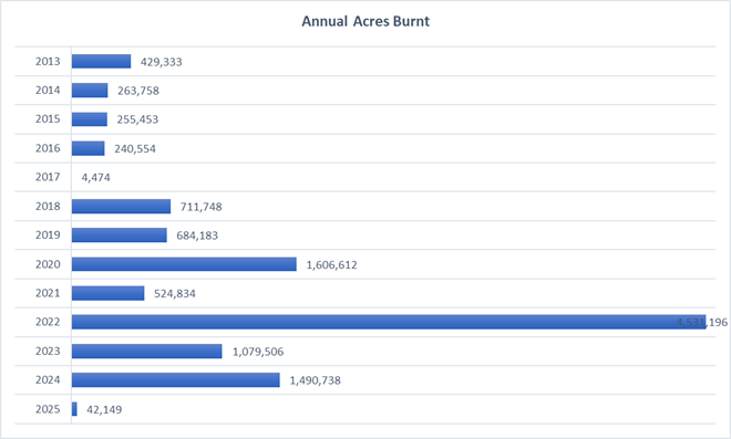 - Wildfires in 2022 indicate the highest annual acres burnt, while in terms of fire incidence, maximum fire cases were observed in 2024.