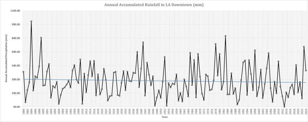 - From 2012 till 2022, the precipitation in Downtown Los Angeles appears to show a below-average rainfall trend, followed by extremely heavy rainfall in 2022-2023. However, that flipped again to relatively dry conditions in 2024.