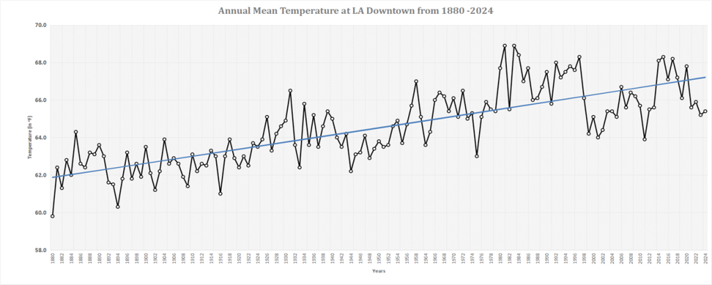 - Figure 7 indicates a clear increasing trend in the mean annual temperature at LA Downtown from 1880 to 2024, consistent with global warming patterns.