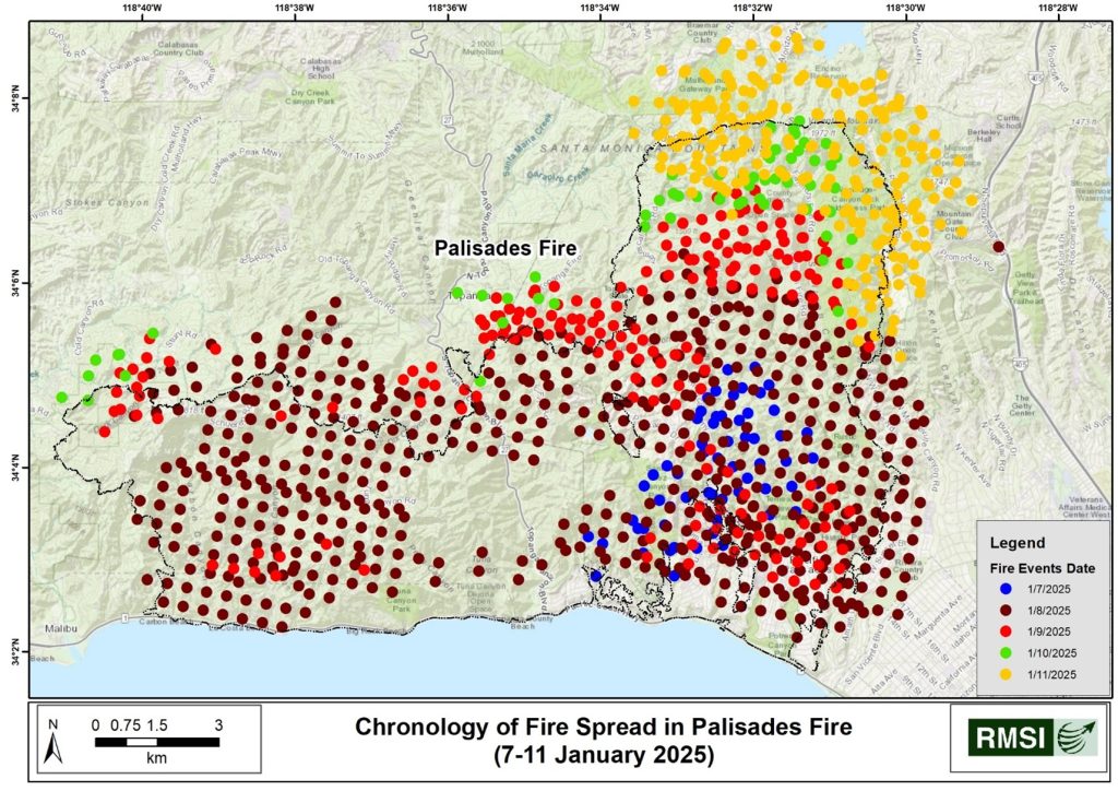 - Figure 8 indicates the spread of the Palisades fire from January 7 to January 11, 2025, across LA County.